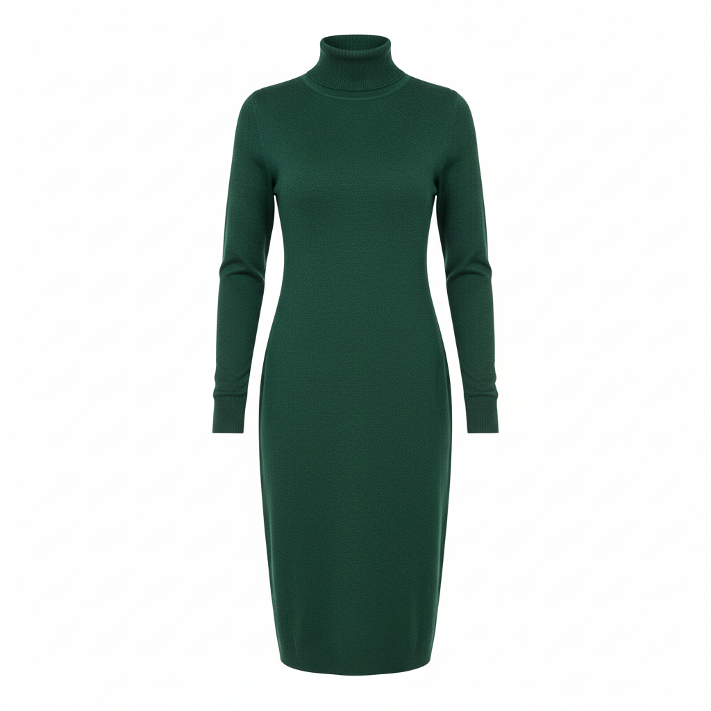 Ova elegantna zelena haljina pruža savršeni spoj stila i udobnosti. S visokim ovratnikom i dugim rukavima, idealna je za hladnije dane, dok rebrasti materijal dodaje sofisticiranost svakom outfitu.