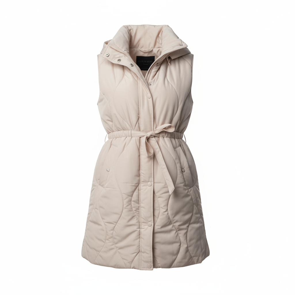 Elegantna duga prošivena prsluk-jakna u prekrasnoj beige nijansi, idealna za jesenske i zimske kombinacije. Lagana, ali iznimno topla zahvaljujući visokom ovratniku i kvalitetnoj postavi. Pojas u struku omogućuje savršeno prilagođavanje figuri, dok praktični džepovi dodaju funkcionalnost za svaki dan. Savršena za slojevito odijevanje, svakodnevne šetnje i chic casual look.