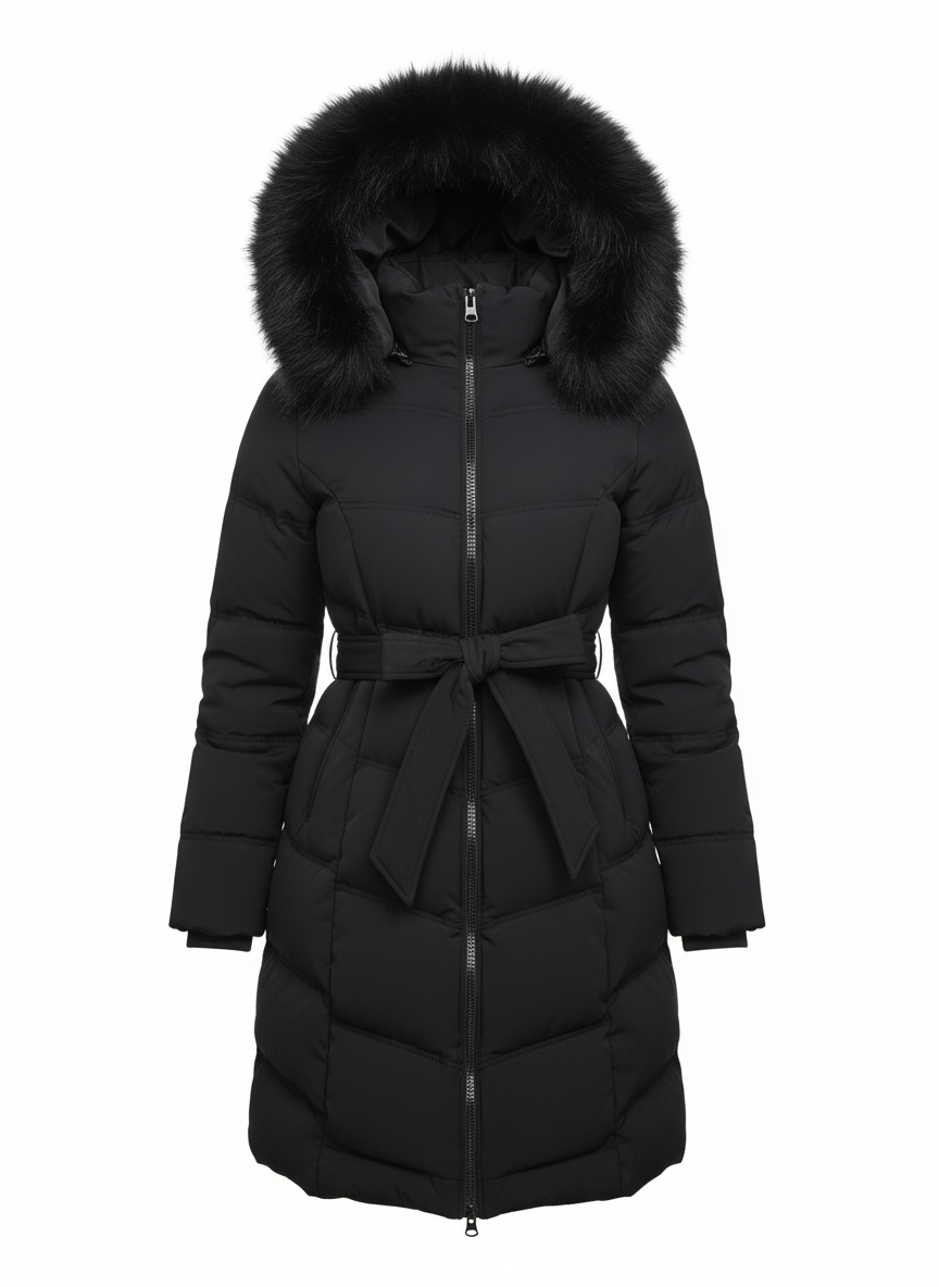 Elegantna duga zimska jakna u sofisticiranoj crnoj nijansi, idealna za hladne zimske dane. Luksuzna kapuljača s bogatim krznenim detaljem daje premium izgled, dok pojas u struku naglašava ženstvenu siluetu. Topla, udobna i iznimno praktična – s dva bočna džepa i kvalitetnim dvostrukim patentnim zatvaračem. Savršena kombinacija funkcionalnosti i profinjenog zimskog stila.