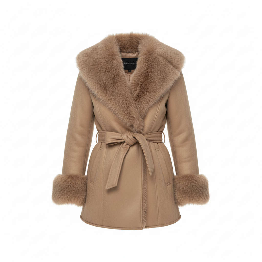 Kaput je obogaćen raskošnim krznenim detaljima na ovratniku i rukavima, koji mu daju glamurozan izgled, dok remen u struku omogućuje prilagodljivo pristajanje i naglašavanje ženstvene siluete. Praktični bočni džepovi pružaju toplinu i funkcionalnost.