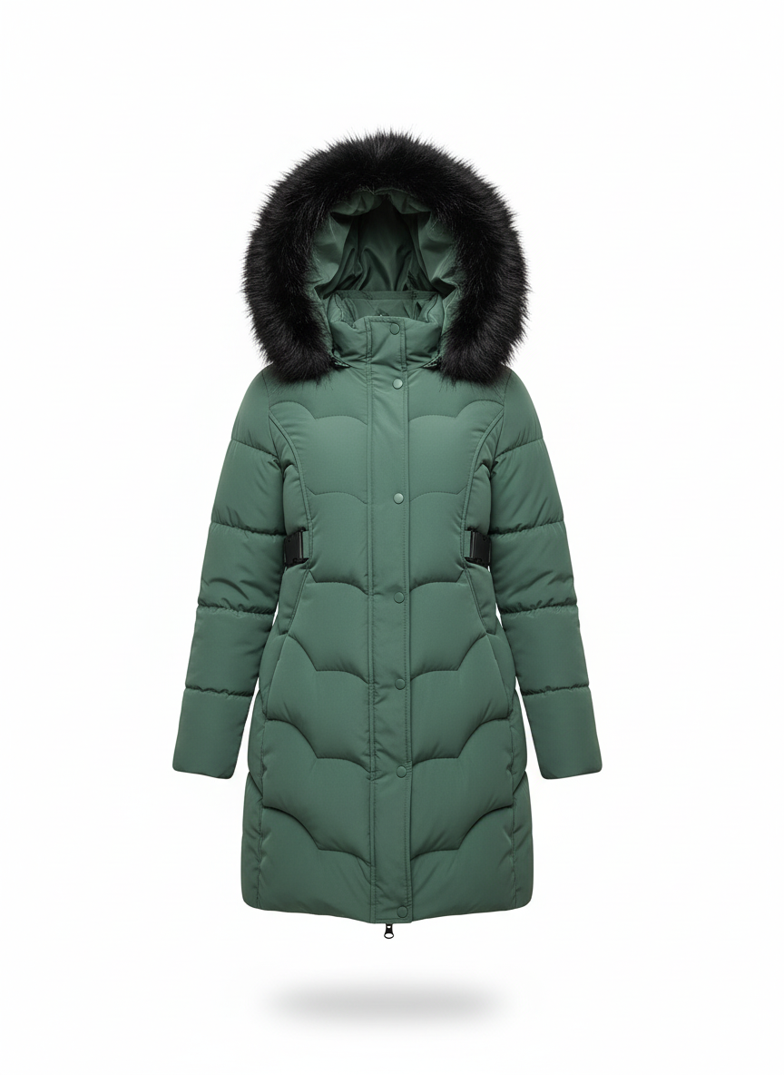 Dugi kroj vizualno izdužuje figuru, dok ugrađena kapuljača s mekanim, crnim krznenim obrubom daje luksuzan i elegantan izgled. Prednji patentni zatvarač, praktični džepovi i podesivi detalji u struku omogućuju savršeno pristajanje i vrhunsku udobnost tijekom cijelog dana.